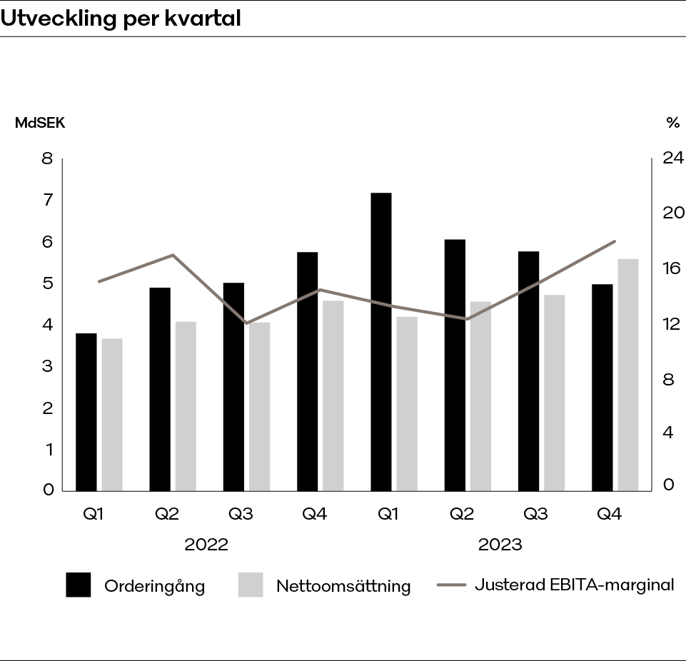 Justerad EBITA ökade jämfört med föregående år, där första halvan av året fortfarande belastades av obalanserade fabriksbeläggningar och fakturering av orderstock med lägre marginalavkastning beroende på icke kompenserade kostnadsökningar sedan tidpunkten för orderbokningen. Den andra halvan av året gynnades av en högre faktureringsvolym, en mer balanserad fabriksbeläggning, effekten av de omstruktureringsaktiviteter som annonserades i fjärde kvartalet 2022 och en mix med högre marginal. Kostnaderna fortsatte att påverkas av inflationstryck, men uppvägdes delvis av en positiv valutaeffekt.
