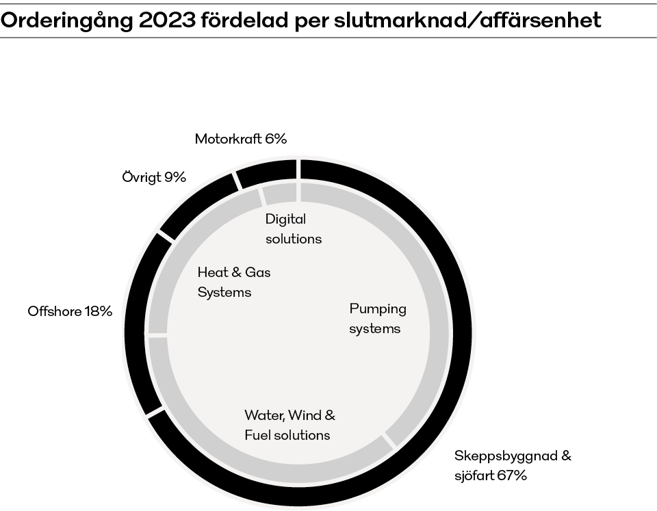 Det underliggande marknadsklimatet relaterat till byggande av nya fartyg var på en högre nivå jämfört med föregående år. Nykontrakteringen har främst drivits av tankers och biltransportfartyg, supporterat av en ganska bra kontrakteringsnivå också inom de övriga fartygssegmenten. Den ökade skeppsbyggnadsaktiviteten har ytterligare kompletterats av en fortsatt växande efterfrågan på hållbarhetsrelaterade lösningar som minskar CO2 utsläpp, inklusive lösningar kring energieffektivitet och bränslen med låga och inga koldioxidutsläpp. Efterfrågan på PureBallast har som väntat minskat ytterligare eftersom färre fartyg återstår att eftermontera innan det regulatoriska slutdatumet 2024 och marknaden blir mer inriktad på nya fartyg. Lösningar som klarar flera bränslen fortsätter att vinna mark. Orderingången för offshore ökade signifikant jämfört med föregående år och det underliggande marknadsklimatet inom detta område var fortsatt starkt på grund av ökade oljepriser och nya projekt för att säkerställa långsiktig energitillgång.