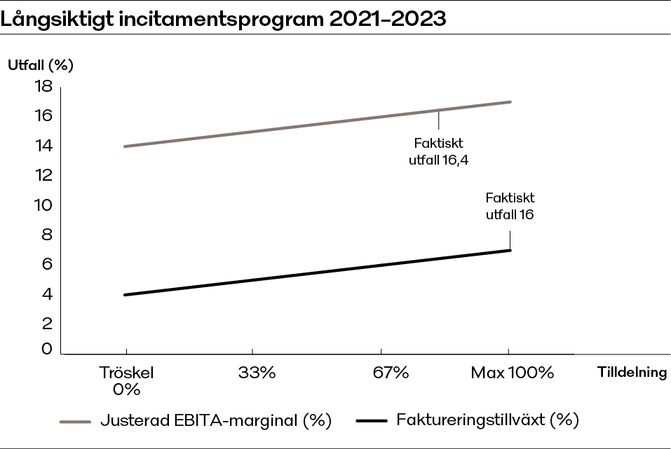 Styrelsen beslutade under 2023 att implementera steg sex av det modifierade kontantbaserade långsiktiga incitamentsprogrammet för maximalt 95 seniora chefer inom koncernen inklusive koncernchefen och de personer som definieras som ledande befattningshavare. Utfallet i det modifierade programmet beror på hur den justerade EBITA-marginalen och faktureringstillväxten har utvecklats över en treårsperiod, med en viktning 50/50 mellan målen. Detta innebär att ingen tilldelning kommer att ske de första två åren i och med att det är först år tre som det kan avgöras i vilken utsträckning målen har uppnåtts. Maximalt utfall utgår när målen överträffas. Ersättningen från det modifierade långsiktiga incitamentsprogrammet kan utgöra maximalt 25, 40 eller 50 procent av den fasta ersättningen beroende på befattning. Utbetalning till deltagarna i programmet sker efter år tre och endast under förutsättning att de fortfarande är anställda vid utbetalningstidpunkten.