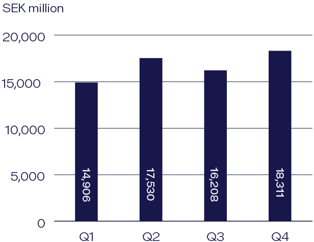 Order intake amounted to SEK 74,592 million in 2024, a growth of 5 percent to 2023. Organic order intake grew 7 percent.